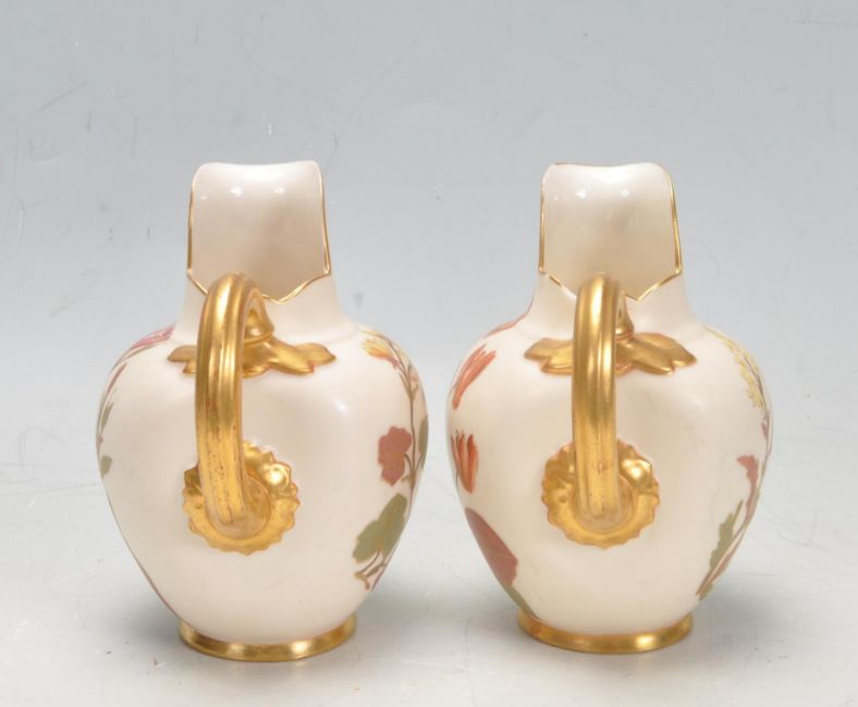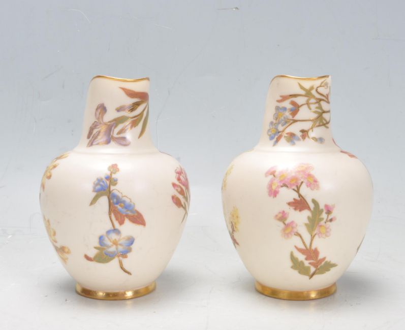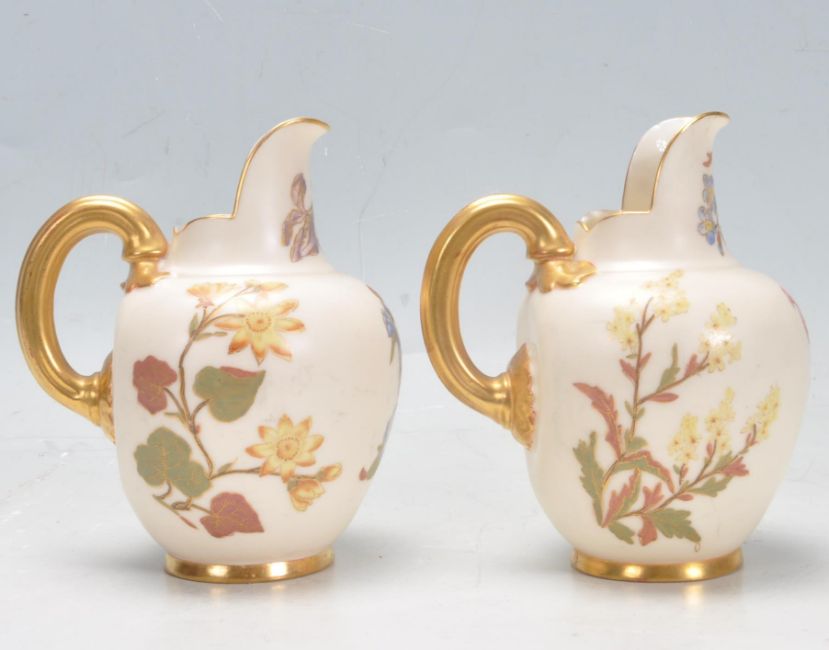 Two antique Victorian 19th Century Royal Worcester Aesthetic movement blush ivory jugs having floral decoration with gilt embellishments to the handle. Makers stamp to the base. Measures 14cm high. Small chip to the rim of jug.