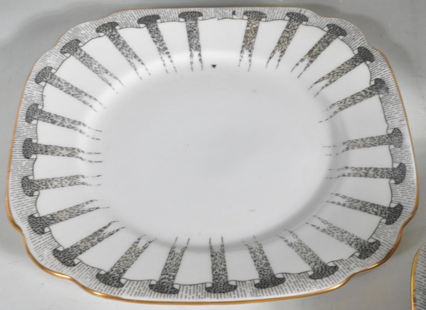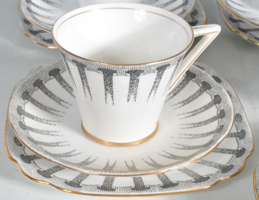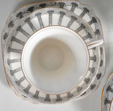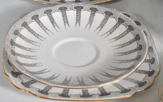 A vintage 20th century Corinth porcelain tea set comprising of cups, saucers, cake plates (trios) and creamer. The set has black geometric patterns to the rim with gilt embellishments.  Makers stamp to the base. Signs of wear and tear commensurate with its age.