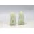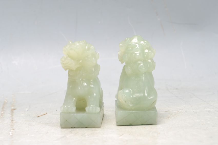 A pair of vintage 20th century Chinese jade style green hard stone temple dogs foo dogs of typical form raised on square bases. Measures 7cm high. Signs of wear and tear commensurate with its age.