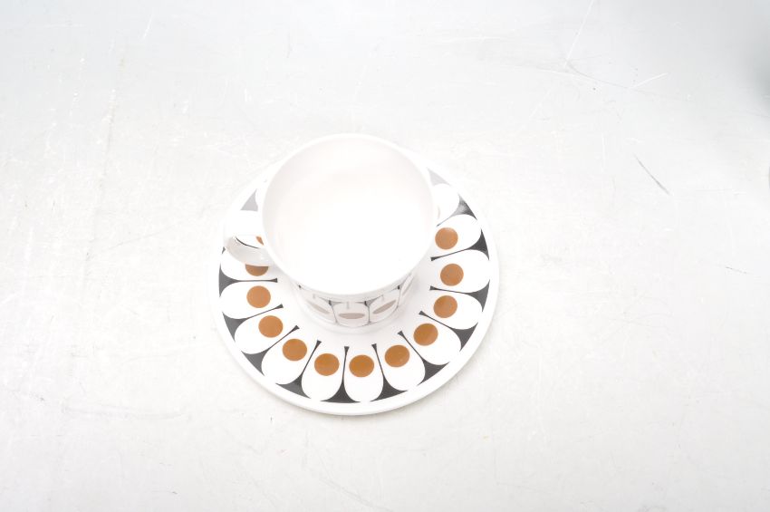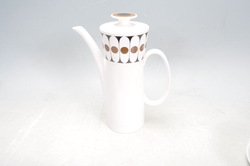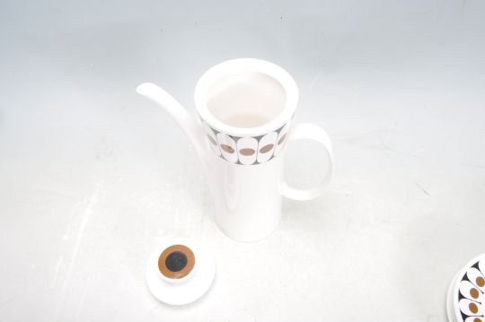 A retro vintage 1960s ceramic Hostess Tableware Angelique tea / coffee service comprising of a coffee pot, creamer jug, cups and saucers. The service has a black and brown retro style decoration throughout. No visible damage. Makers stamp to the underside Measures 23cm tallest.