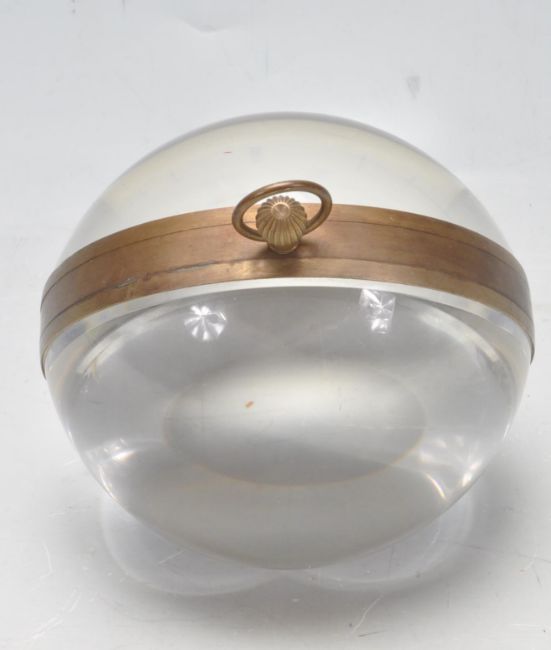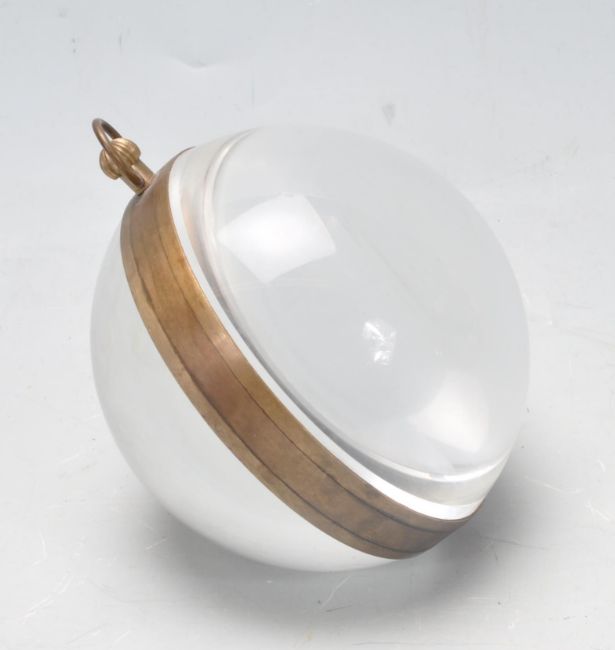A Roman style fish eye ball clock, keyless wind movement, the white dial with Roman numerals and signed Omega, faceted metal hands, housed within a glass ball case, 11cms high.