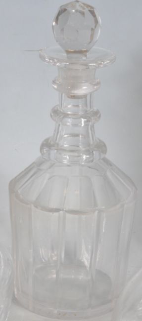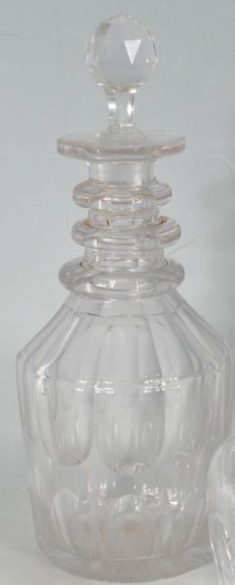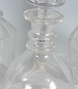 A collection of five 18th century and 19th century George III glass decanters of various sizes and shapes. The collection include ovoid shape glass decanter with facet cut decoration, double and triple plain neck ring, two with mushroom stoppers. Measures approx.: 26cm tall.
