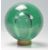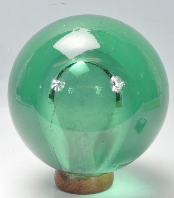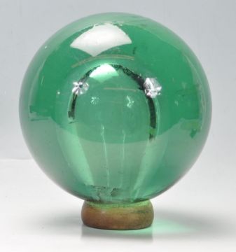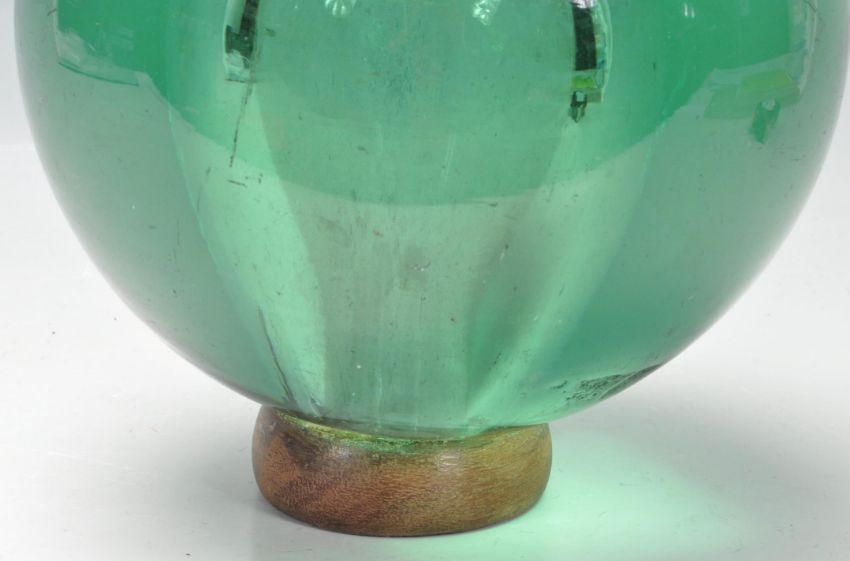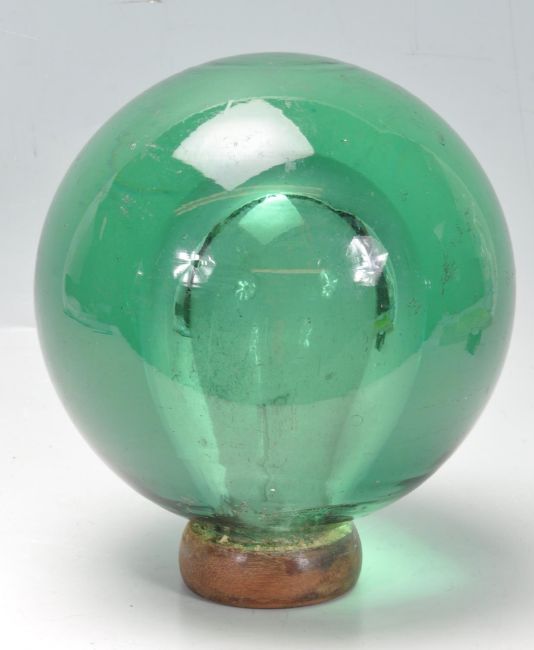 A large and unusual 19th Century Victorian green glass dump paperweight of globular hollow form, raised on a wooden base stand. Measures 22cm tall. Wooden base loose from the paperweight, in need of re gluing. Measures 23cm tall.
