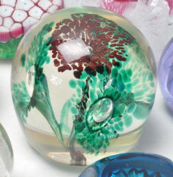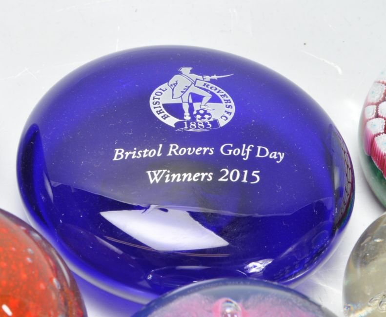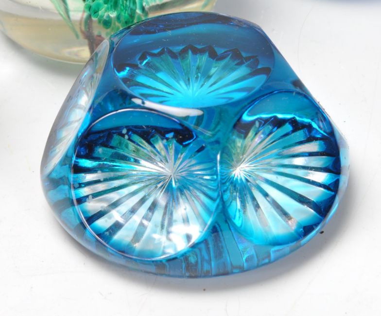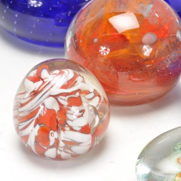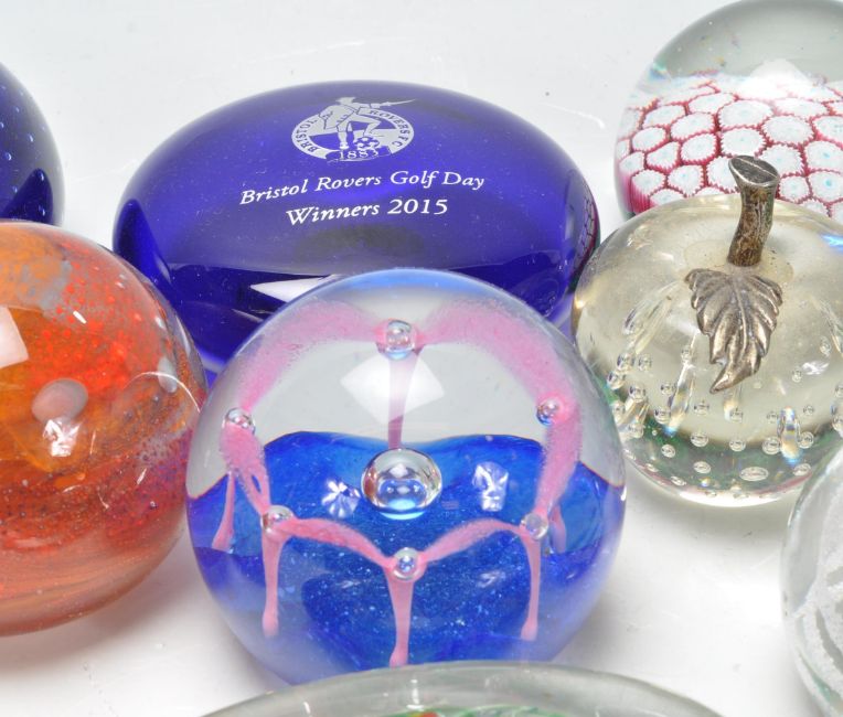 A collection of vintage 20th century studio glass paperweights of various sizes and shapes to include Caithness, Bristol Blue, Mdina, Murano, etc. Condition: Good used condition. Measures 11cm tallest.