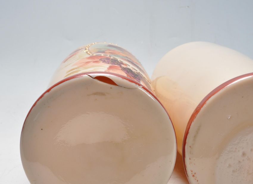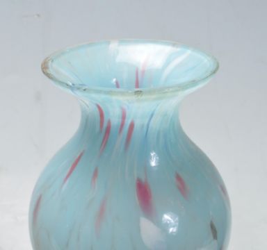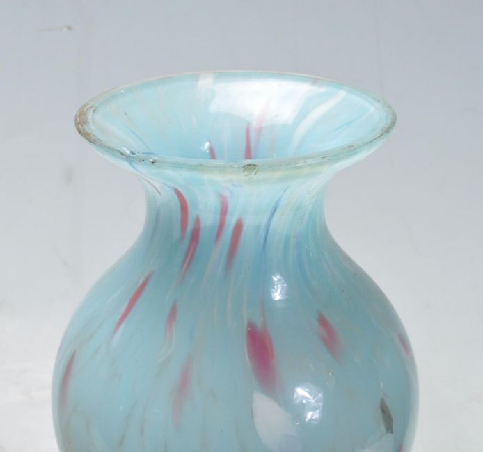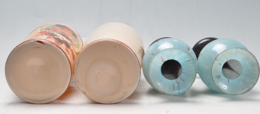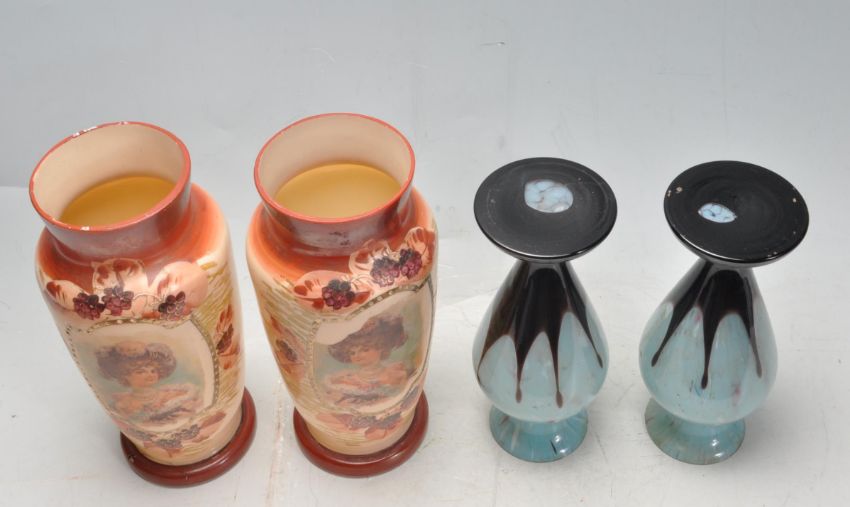 A pair of 19th century Victorian mirror panel vases. The vases having a large central panel depicting a ladies surrounded by hand painted botanical decoration motifs to the outside along with pair of studio art glass vases in the manner of Murano.