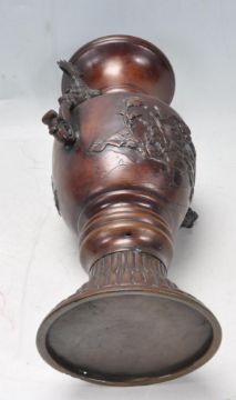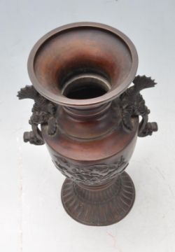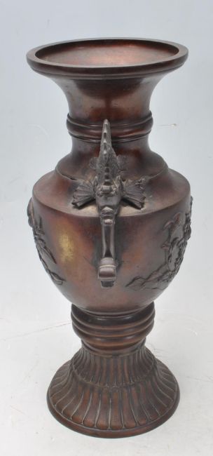 An antique Meiji period Japanese oriental bronze vase. The vase of a baluster form with waisted neck, twin fish handles to the side and raised floral and birds motifs to the centre, raised on pedestal base. No makers marks. Measures: 31cm tall