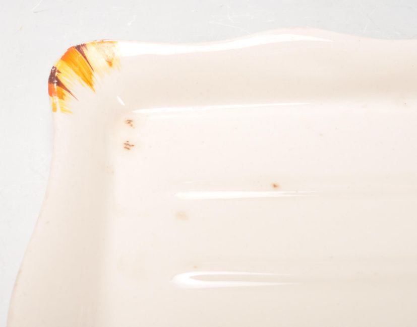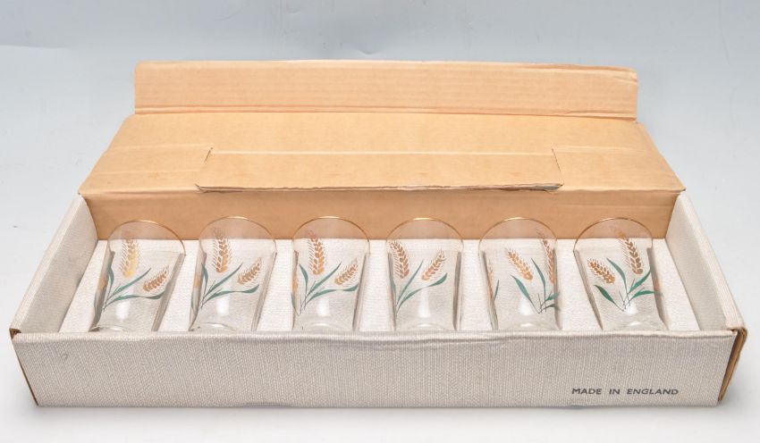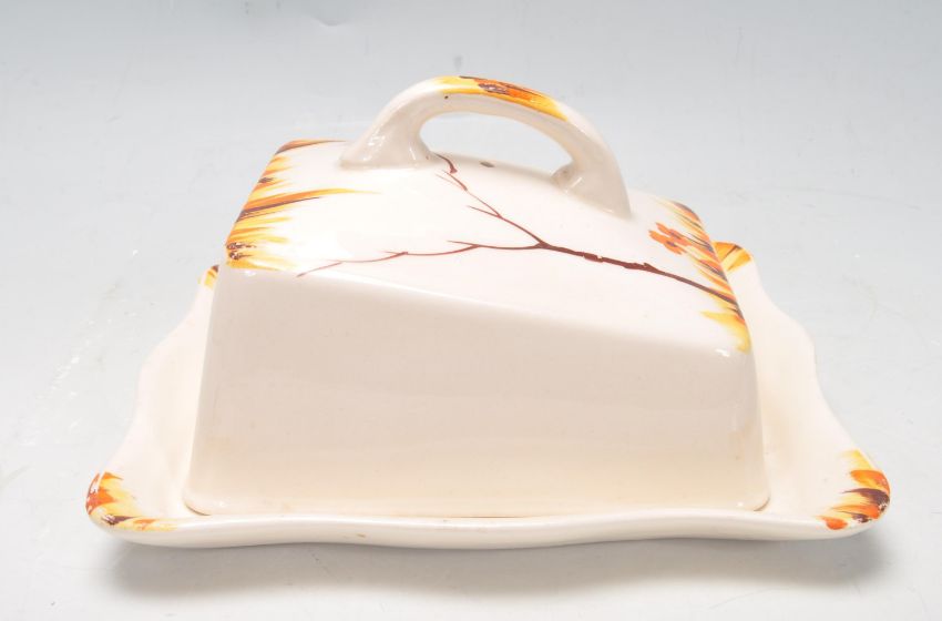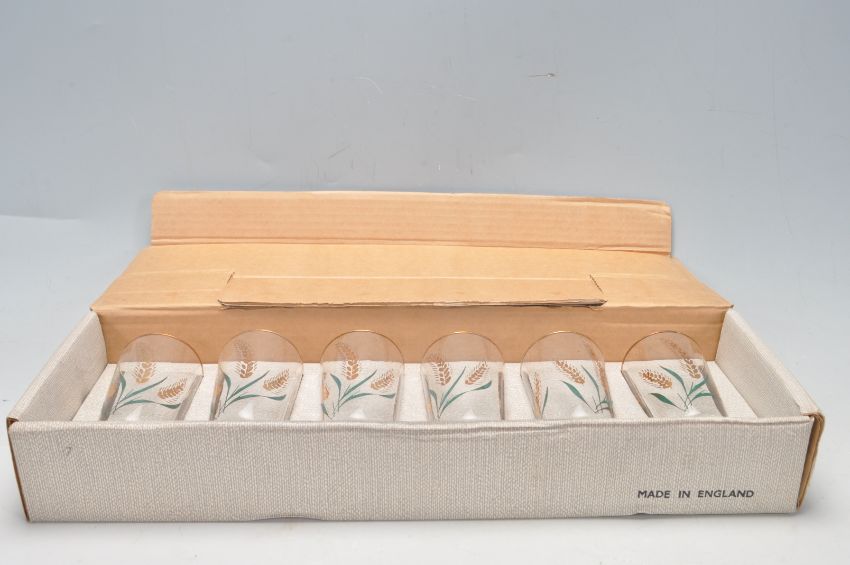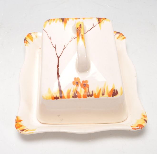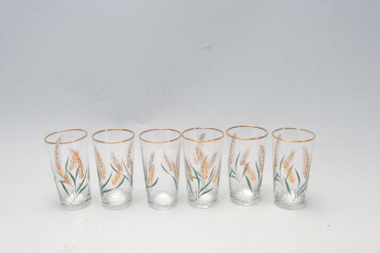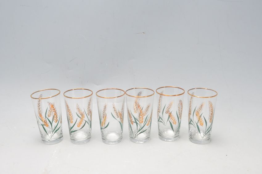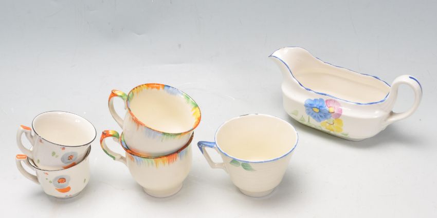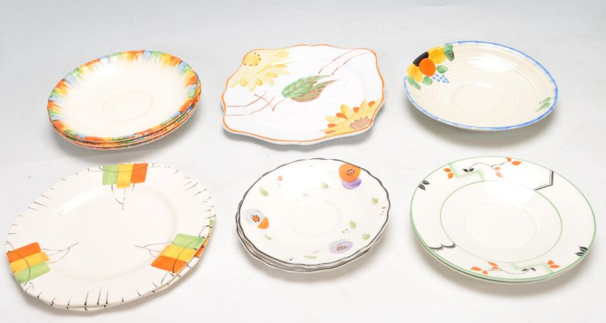 A collection of early 20th century hand painted Art Deco ceramic ware to include tea cups, saucers, cake plates, serving plates, creamer jugs, butter tray, etc alongside a set of Chesterfield Golden Grain glasses.  To include Myott, Palissy and Burgess.