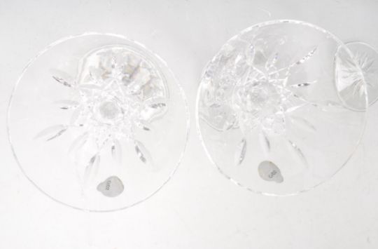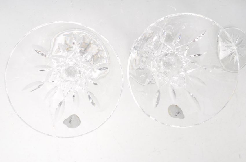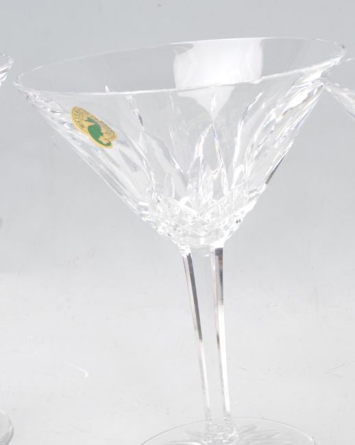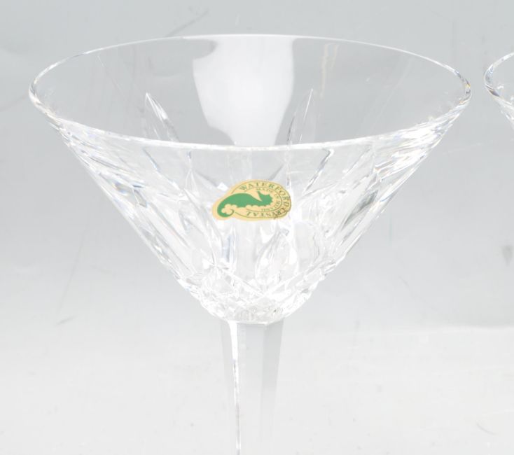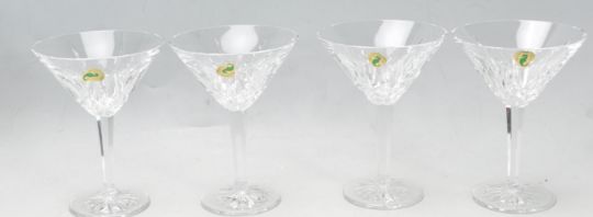 A set of four Lismore pattern Waterford crystal Martini glasses having geometric lattice decoration. Comes boxed. Comes with original sticker. Measures 15cm high