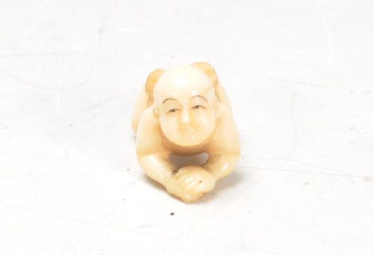 An early 20th Century Japanese carved ivory netsuke figurine in the form of a crawling child / baby in traditional clothing, signed to the belly. Measures 1.5cm tall.