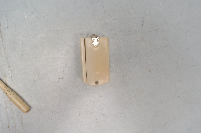A late 19th century Victorian ivory notepad. The not pad having six fan shaped note slides with a pen to the side along with with an early 20th century bone cigarette cheroot decorated with Chinese motifs.