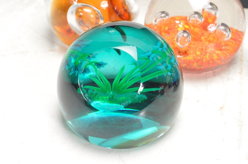 A collection of retro vintage studio art glass paperweight. Collection comprises of Caithness and others. Paperweights include Jubilee Orchid, Fireform, Reflections Magenta and others. Some boxed.