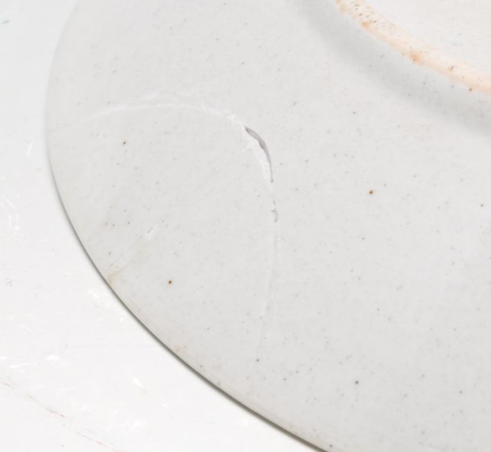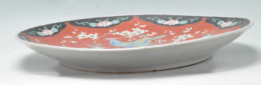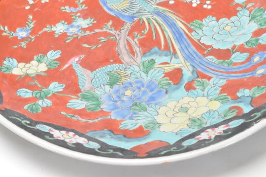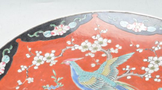 A large early 20th century Japanese oriental ceramic porcelain charger plate. The large circular charger having depicting two birds of paradise on a red background with floral motifs to the margins. Measures: 37cm diameter. Condition A/F