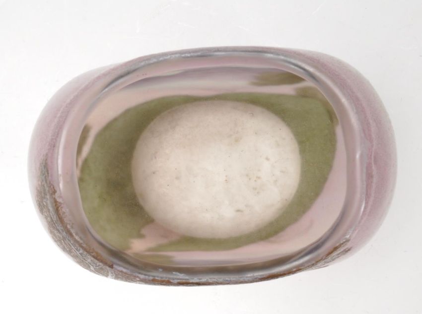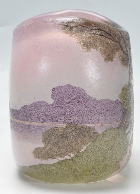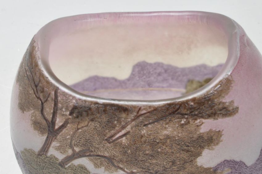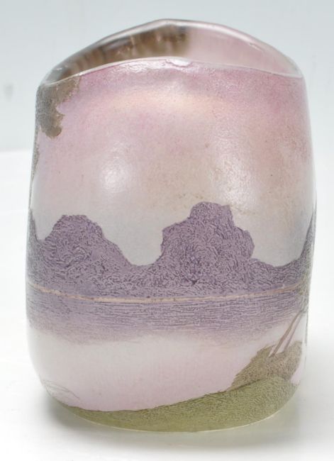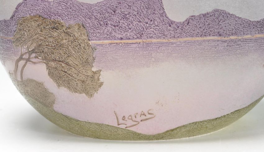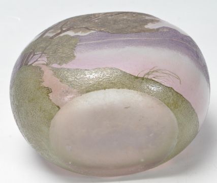 A vintage retro 20th century studio glass French Legras vase. The vase of a pebble form decorated with green trees on a purple background. Signed to the side Legras. Measures: 11cm high x 13cm wide x 8cm deep. Condition: good condition overall, few small nips but nothing major. They hardly can be spotted. Measures 11cm tall.