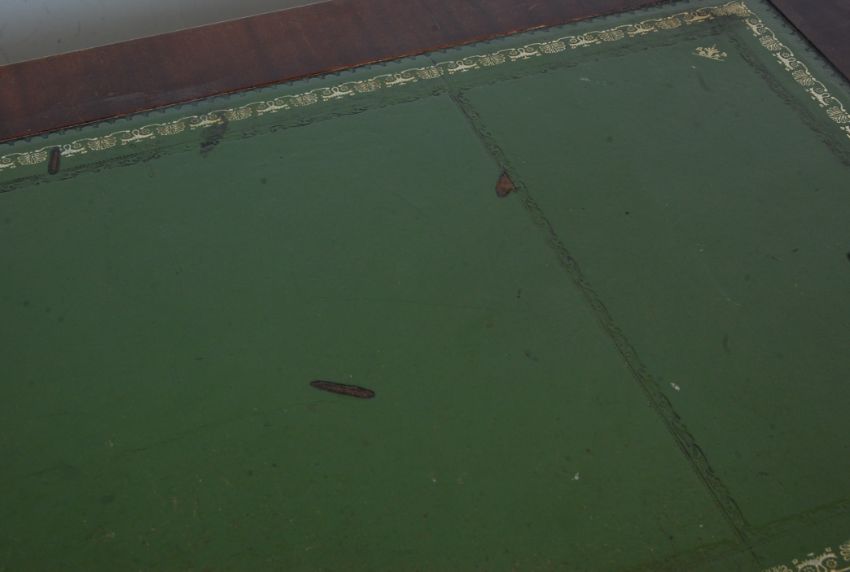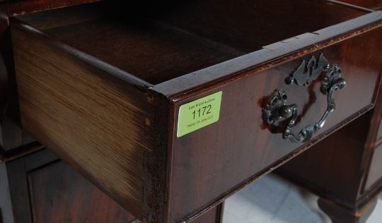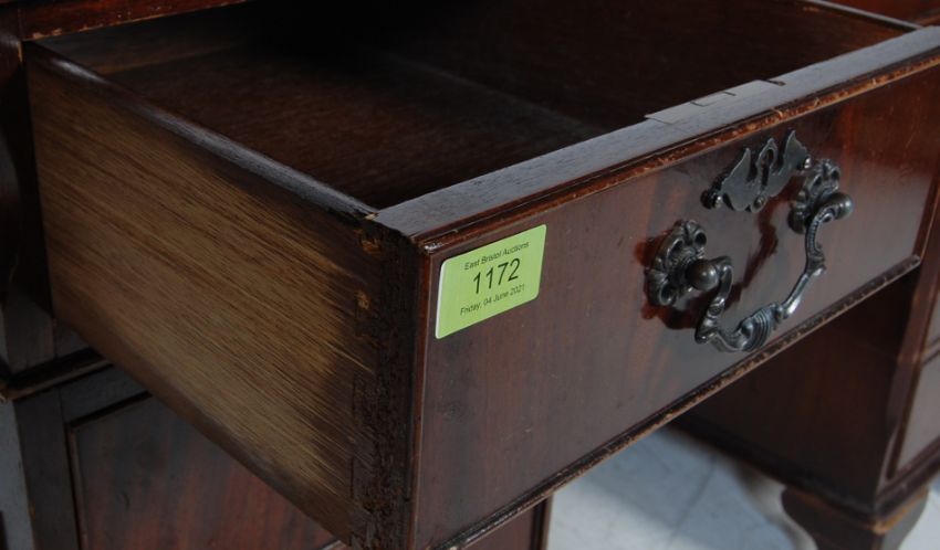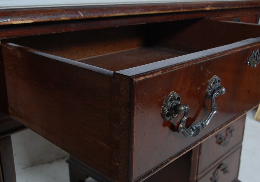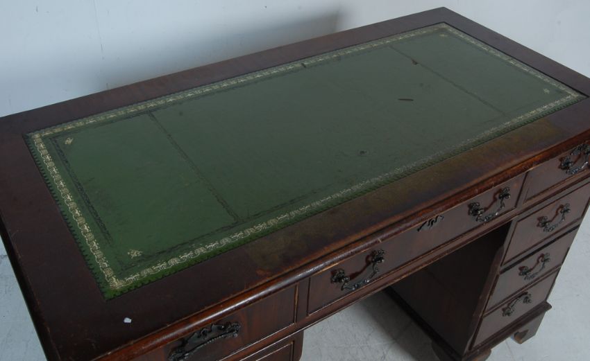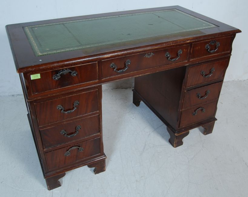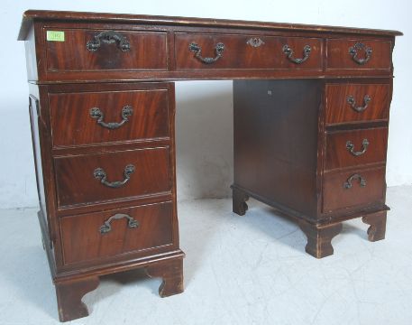 A Georgian Revival antique style mahogany pedestal desk having a gilt tooled leather skiver over a run of three drawers with swan handles raised on twin pedestals atop plinth bases. 80cm h x 124cm w x 62cm d