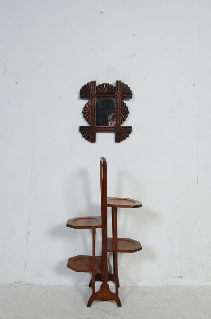 An early 20th century circa 1930’s oak metamorphic folding cake stand. The stand of a tall form with four floating plate stand and arched handle atop raised on splayed base along with a oak carved walk mirror.