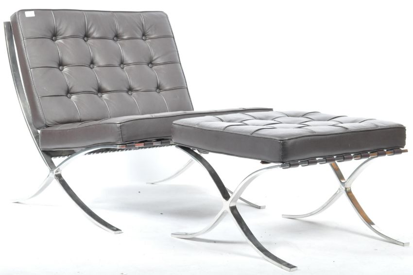After Ludwig Mies Van der Rohe & Lilly Reich - Barcelona Chair & Footstool - A contemporary low easy / lounge chair / armchair and matching ottoman footstool having a chromed steel ' X ' frame with brown leather strapping and leather button backed cushions for backrest and seat. Measures: 75cm x 76cm x 77cm.