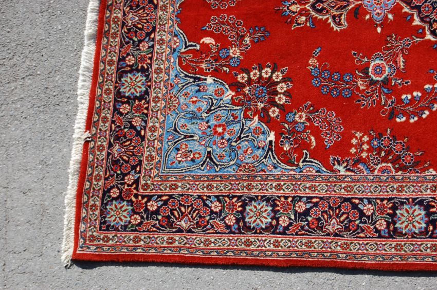 A 20th century antique Persian Islamic Sarouk handwoven wool carpet rug decorated with multicolour foliate motifs and medallions on a red field. Measures 220cm x 134cm