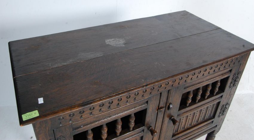 An early 20th century Jacobean Revival ecclesiastical style credence table / hutch cupboard having a flared top with pierced doors with turned supports raised on turned legs united by an undertray.