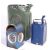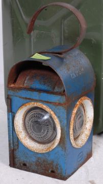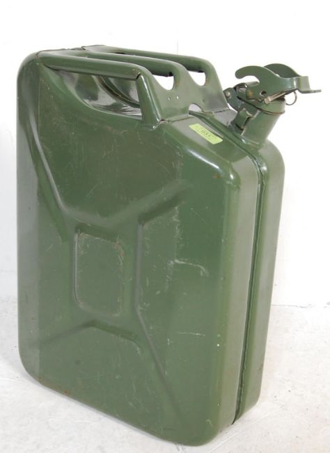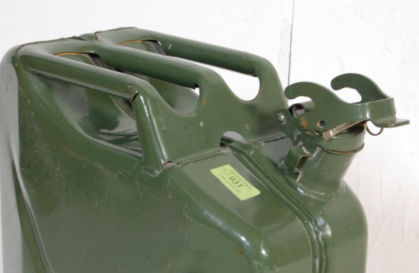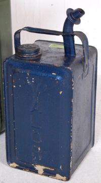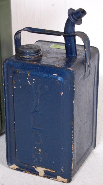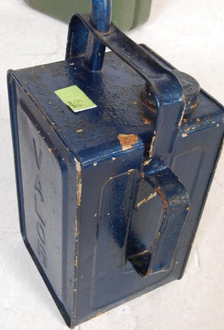 A vintage retro 20th century metal 20L jerry can together with Old Valor Paraffin dispenser and a blue vintage Kenlite MC & W road lamp with original burner.