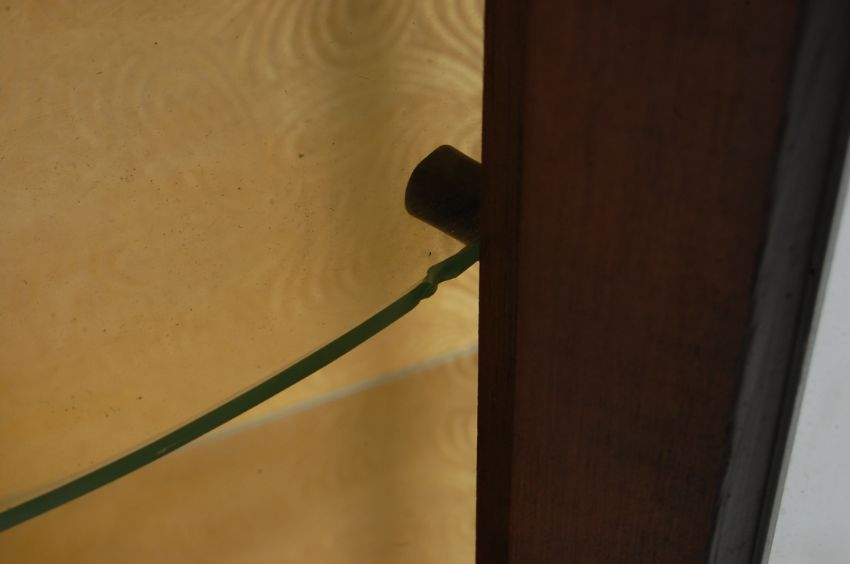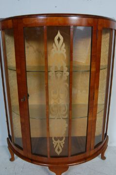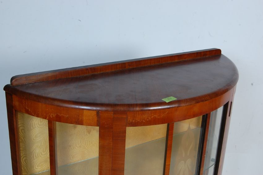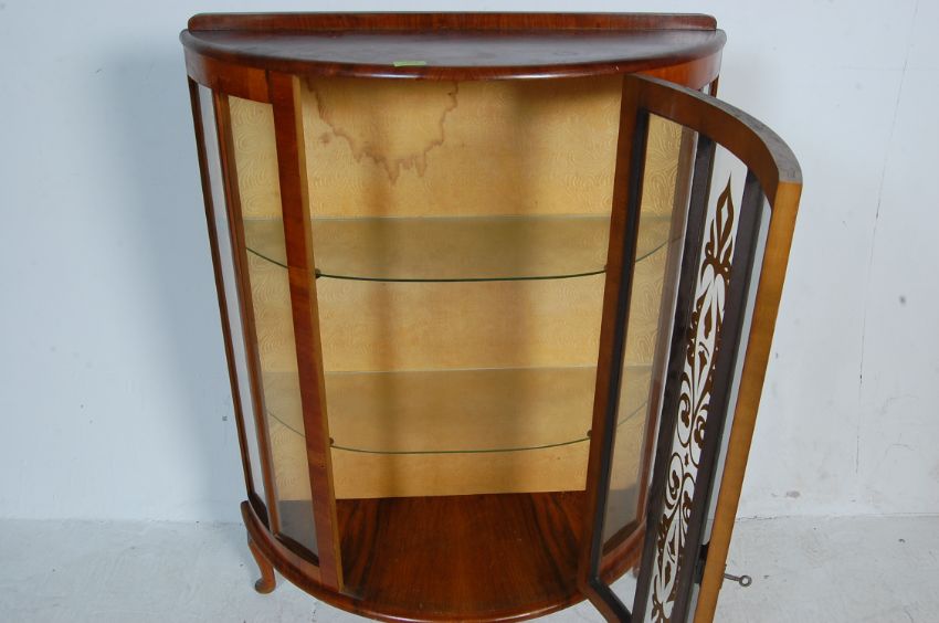 A 1950s vintage walnut veneer bow fronted china display cabinet having a raised back over a single glazed door opening to reveal a shelved interior raised on pad feet. Measures 116cm x 84cm w x 33cm d