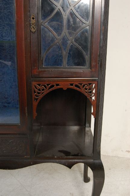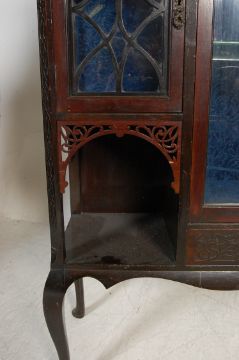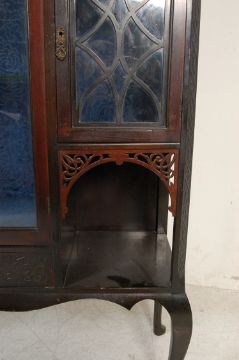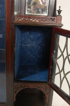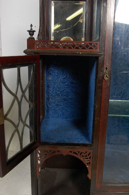 An antique 19th century Victorian mahogany Chinese Chippendale /  death cabinet / Black Willy / china display cabinet vitrine having a raised mirror back with pierced gallery over geometric detailing atop a large central glazed cupboard flanked by smaller cupboards with pierced spandrels raised on tapering supports. Measures 197 x 108 x 38cm.