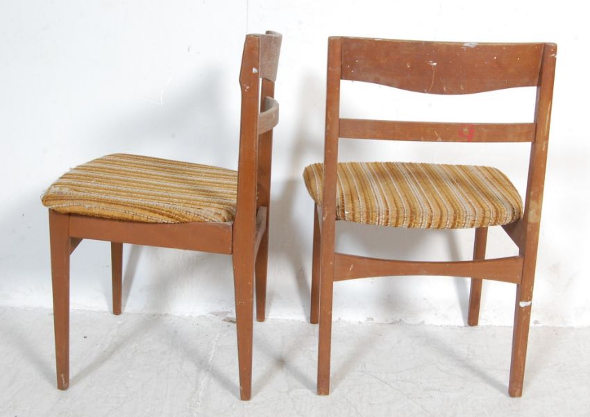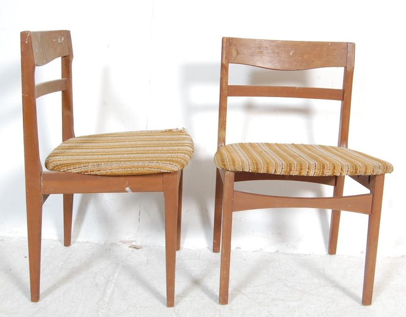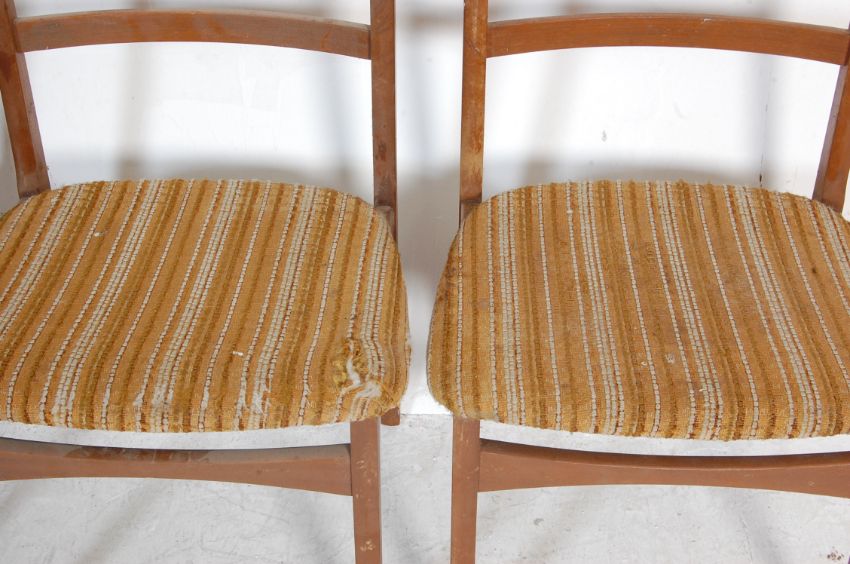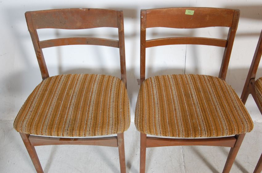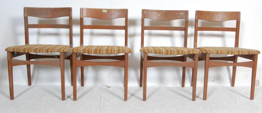 A set of four vintage retro 20th century teak wood dining chairs by nathan. The dining chairs having curved ladder backrests, padded seats raised on tapered legs united by stretchers. Makers marks to the underside. measures. 75cm h x 50cm w x 45cm d