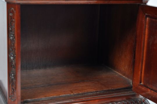 A 20th Century antique revival flame / plum pudding mahogany pot cupboard / bedside cabinet having a front canted top with good grain door to front. Carved canted corners with spacious open interior. The legs and apron further carved with acanthus & oak leaved with garooning borders. A good quality reproduction example. Measures approx; 82cm x 51cm x 34cm