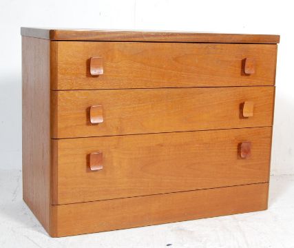 Stag - Cantata - A retro vintage teak wood lowboy chest of drawers having a bank of three spacious drawers with shaped wooden handles raised on an upright base. 62cm h x 84cm w x 44cm d
