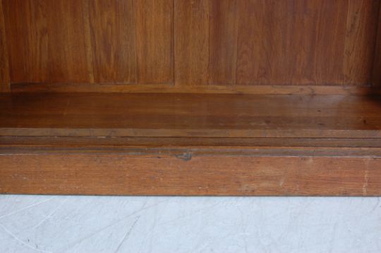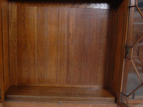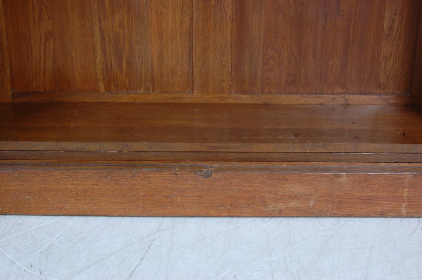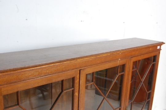 An antique 1920s early 20th century oak library bookcase cabinet having a flared top over astragal glazed doors opening to reveal a shelved interior raised on a plinth base.