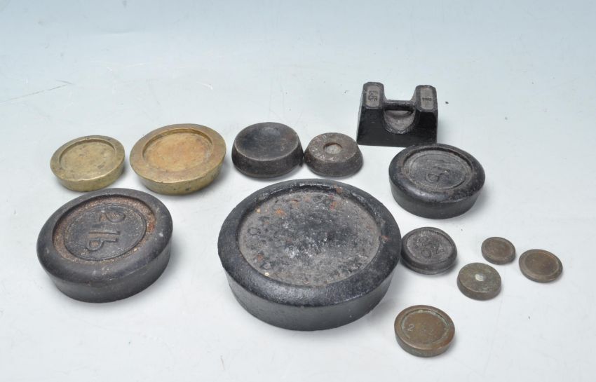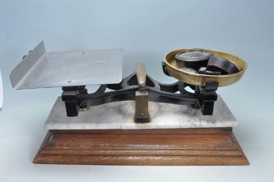 An early 20th century 1920s marble topped butchers balance scales having a brass pan to one side with metal shelf to the other raised on a wooden plinth base. Comes with weights. Measures 60cm wide.