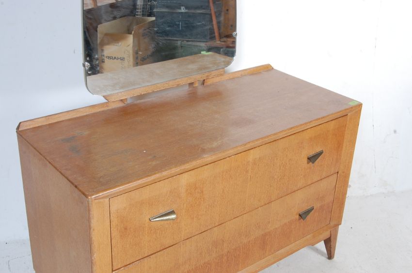 A vintage retro 20th century oak veneer dressing table chest. The dressing table having a shape mirror atop over two long drawers raised on angular supports. 150cm h x 107cm w x 46cm d