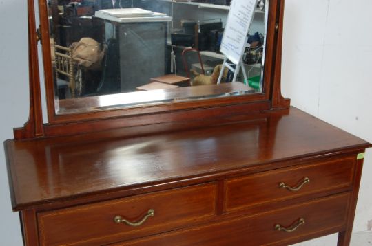An early 20th century Edwardian mahogany inlaid dressing table. The desk table having a bevelled glass mirror atop with a dome top above two short drawers and a single long drawer with brass swing handles raised on square tapered support with brass casters.