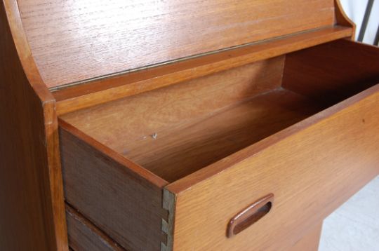 A retro vintage teak wood student bureau having a fall front writing area opening to reveal a fully appointed interior atop a bank of three spacious drawers raised on bracket feet. 108cm h x 73cm w x 36cm d