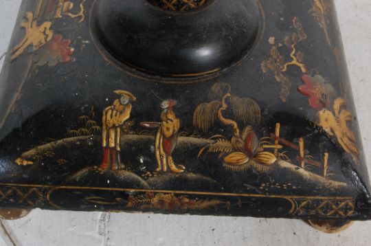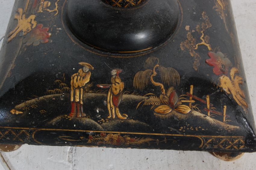 An vintage 20th century Chinese oriental chinoiserie black lacquer floor standing lamp. The lamp having turned column decorated with gilded Chinese scenes raised on a square base with bun feet. Measures 160cm.