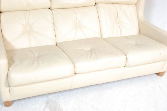 A retro wit age 20th century Danish inspired three seater cream leather sofa settee. The sofa having wingback style backrest with detachable cushion, square armrests raised on wooden block feet. 81cm h x 177cm w x 74cm d