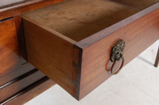 An 18th century Georgian mahogany pianoforte sideboard having a flared top decorated with inlay over a run of three drawers raised on tapering legs. Converted from a square piano. Measures. 76cm h x 64cm w x 61cm d