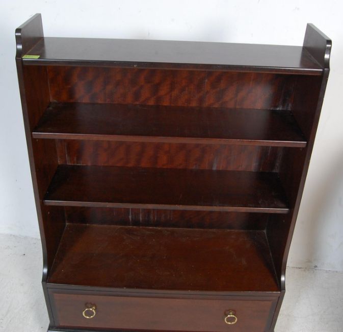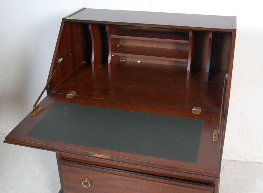 A suite of retro vintage late 20th century Stag Minstrel Makore / African Cherry furniture comprising of bureau, bookcase & a lowboy all having brass hoop handles. Makers label to the inside. 99cm h x 76cm w x 45cm d