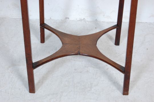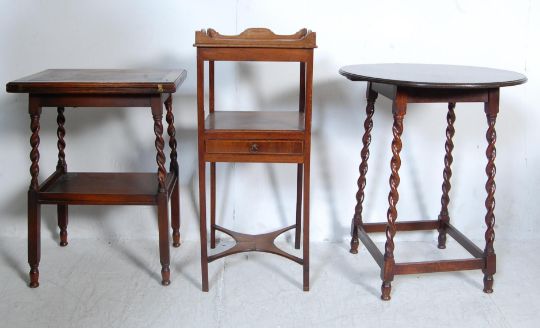 A George III mahogany night stand. The stand having a rectangular top with shaped gallery above a opened a single drawer raised on square legs united by cross stretchers along with two occasional tables having barely twist legs. Measures 71cm tall x 60cm diameter.