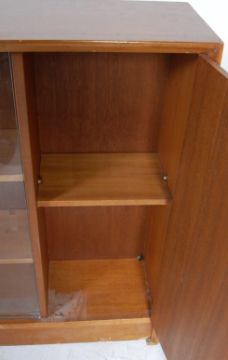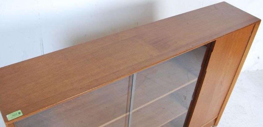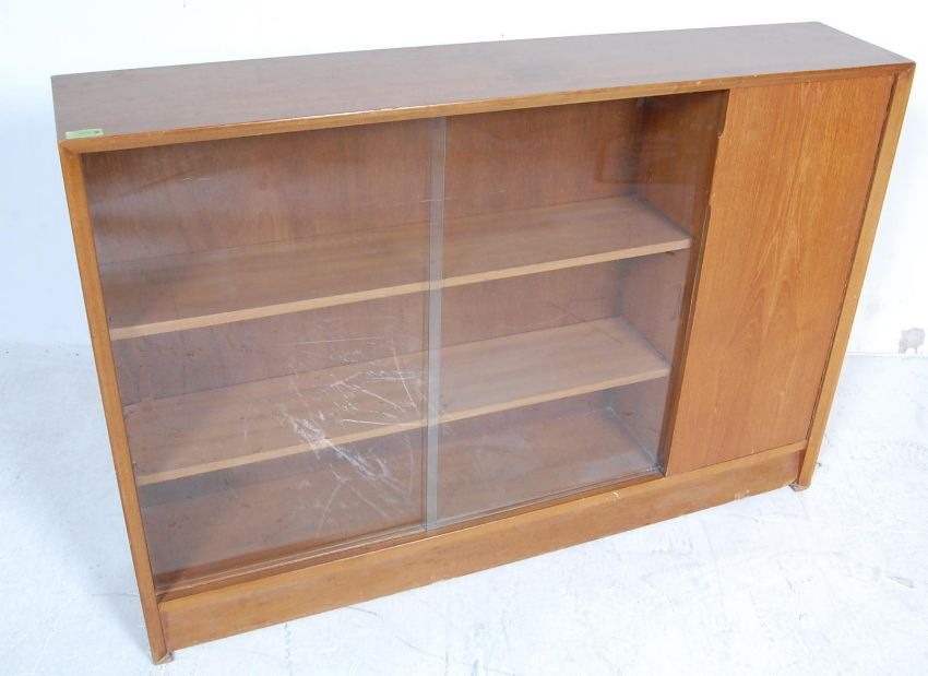 A vintage retro 20th century teak wood bookcase / display cabinet by Herbert Gibbs. The cabinet having panel door to the right and twin sliding doors to the left with adjustable shelves raised on a plinth base. 85cm h x 122cm w x 24cm d