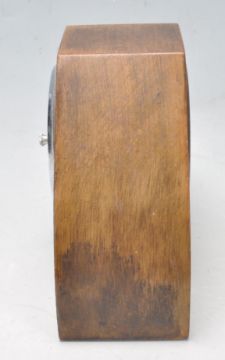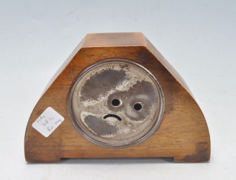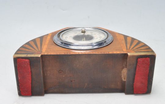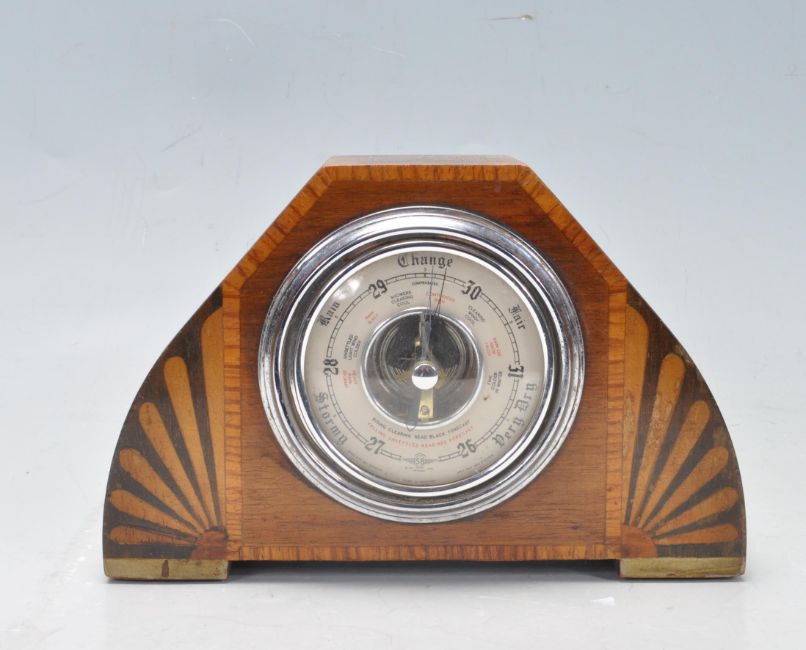 An early 20th century Art Deco oak mantel barometer manufactured by Shortland Smiths. The barometer has a circular dial flanked by sunburst shaped inlay.