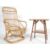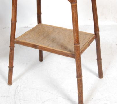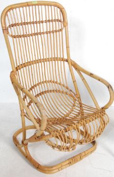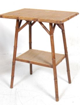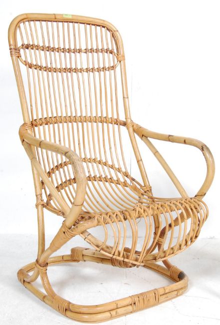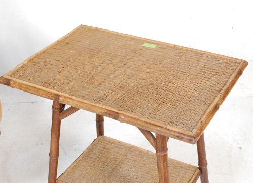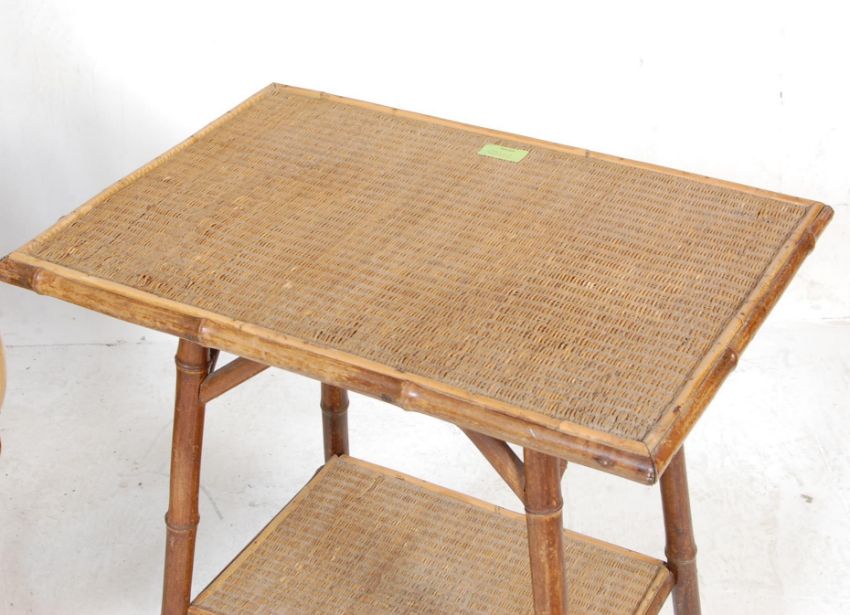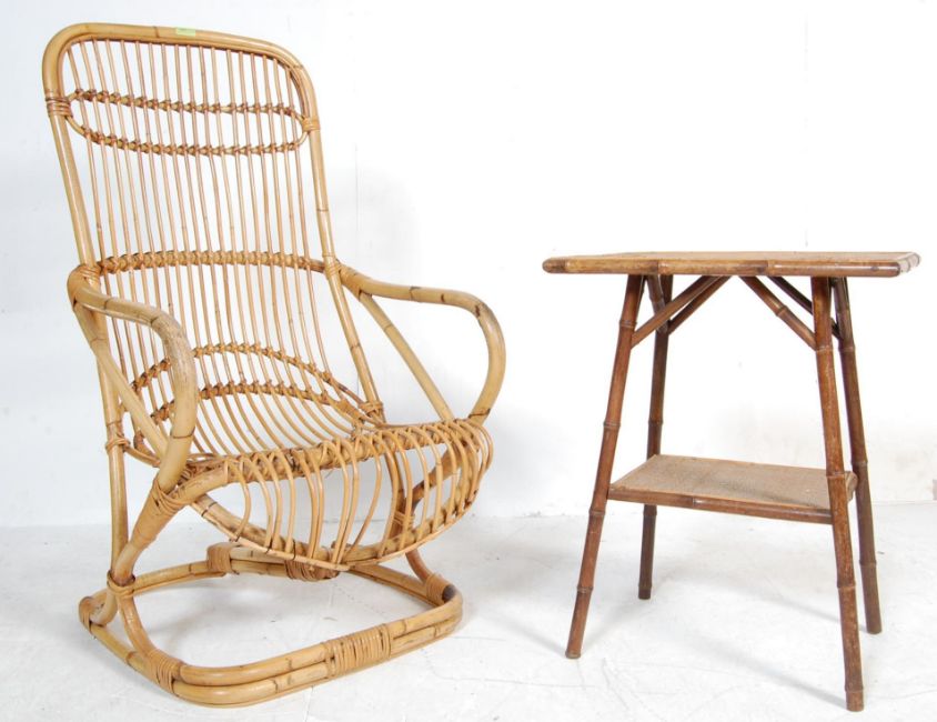 A vintage retro 20th Century cane wicker conservatory arm chair in the manner of Franco Albini having a bent cane frame, together with a bamboo side table having a rectangular top with second tier raised on splayed bamboo legs with corner supports.