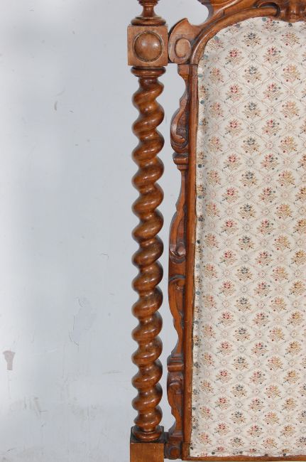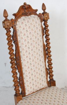 A 19th century Victorian mahogany nursing chair. The chair having a high back with carved crest flanked by two barley twist columns with padded seat and backrest raised on turned legs with ceramic casters.