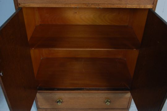 An early 20th century 1930s Art Deco style light oak tallboy chest of drawers having a raised back over a twin handled drawer. The tallboy chest has a door cupboard opening to reveal a spacious interior over another twin handled drawer raised on an inset base. Measures 125 x 83 x 45cm.