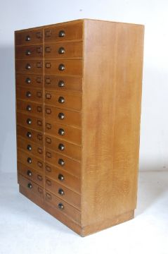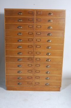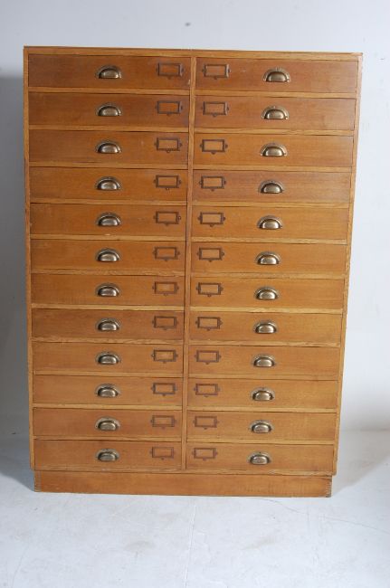 A large impressive vintage early 20th century oak 24 drawer museum specimen collectors cabinet bank of drawers. The cabinet having two banks of twelve oak fronted dovetail jointed drawers with original brass D cup handles. Each drawer having brass label / name holders. Measures 169 cm H x 119 cm W x 61 cm D