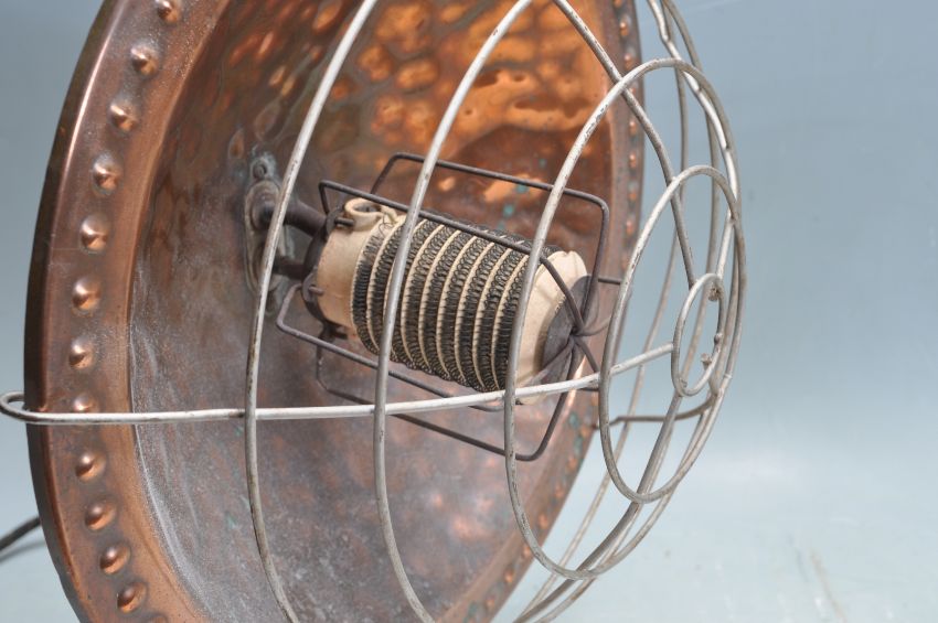 A retro vintage 20th century Pifco desk top fan having a chrome cage with a deep red three blade fan raised on a cream plastic base. Together with a retro vintage 20th century heat lamp.