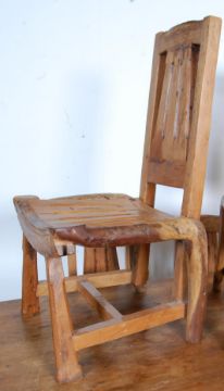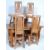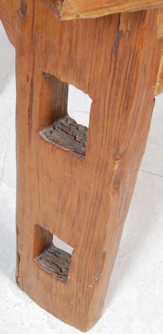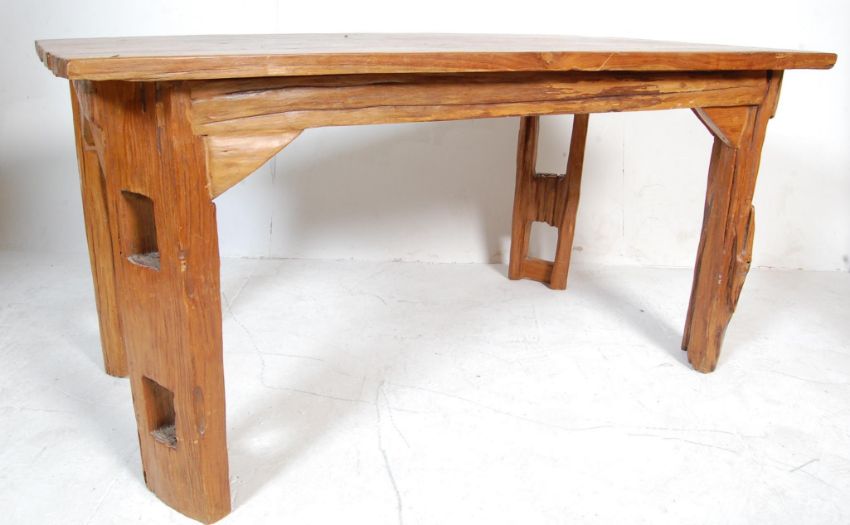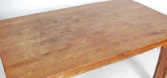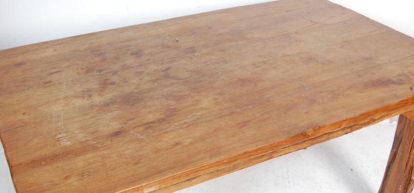 A vintage retro 20th century oak dining table and chairs. The large country style dining table having an rectangular top raised on salvage cart  wood legs with pierced decoration along with a set of matching dining chairs with similar wood. 76cm h x 150cm w x 91cm d