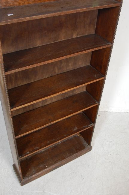 An early 20th century oak open window bookcase in the manner of Liberty of London. The bookcase having a small gallery back atop with four wooden shelves, beaded decoration to the margins raised on a plinth base.