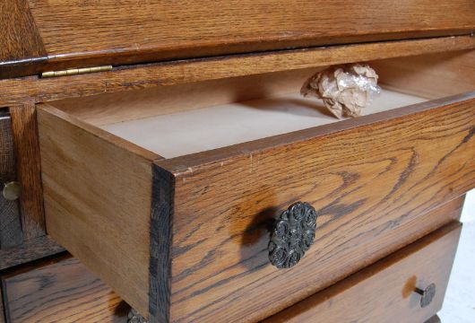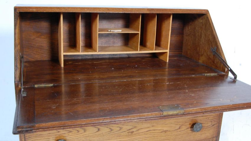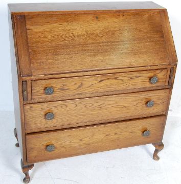 A 1930s early 20th century antique style oak bureau. The bureau having a fall front with compartmented interior above a bank of three drawers with cast metal pull handles raised on turned legs. 100cm h x 92cm w x 40cm d
