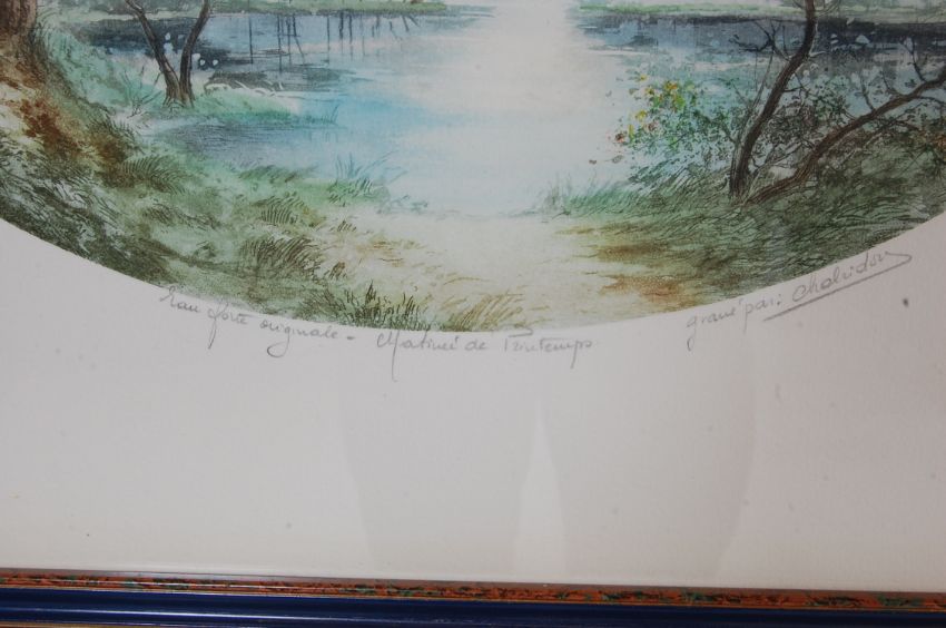 Jean-Joseph Chabridon (French 20th Century) - A pair of hand coloured lithograph prints depicting landscape scenes featuring river side trees. Signed in pencil. Framed and glazed. Each measures 47 x 56 cm. Good condition.