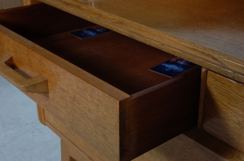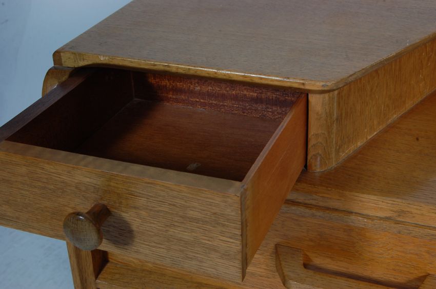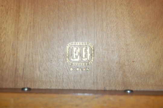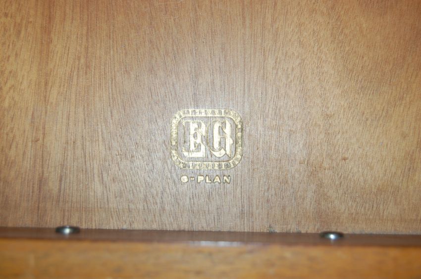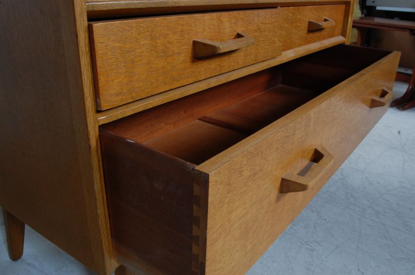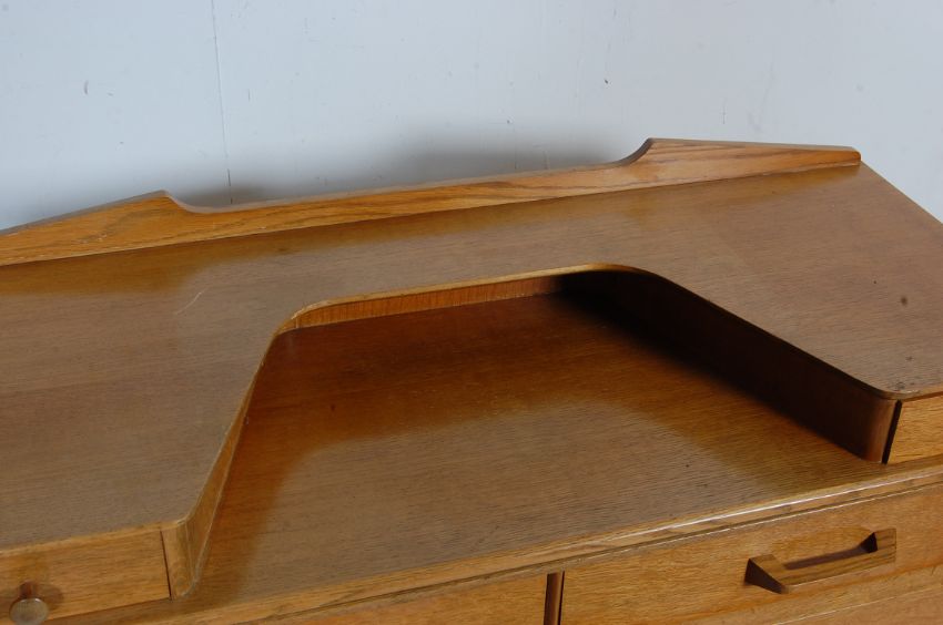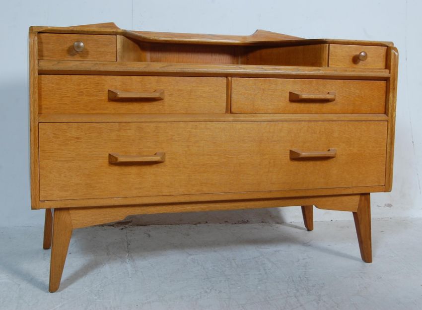 A retro vintage mid 20th century 1950s golden oak Brandon range G plan dressing table having a drop centre flanked by two drawers atop a bank of two over one drawers raised on tapering legs. E Gomme gilt stamp to the drawer.